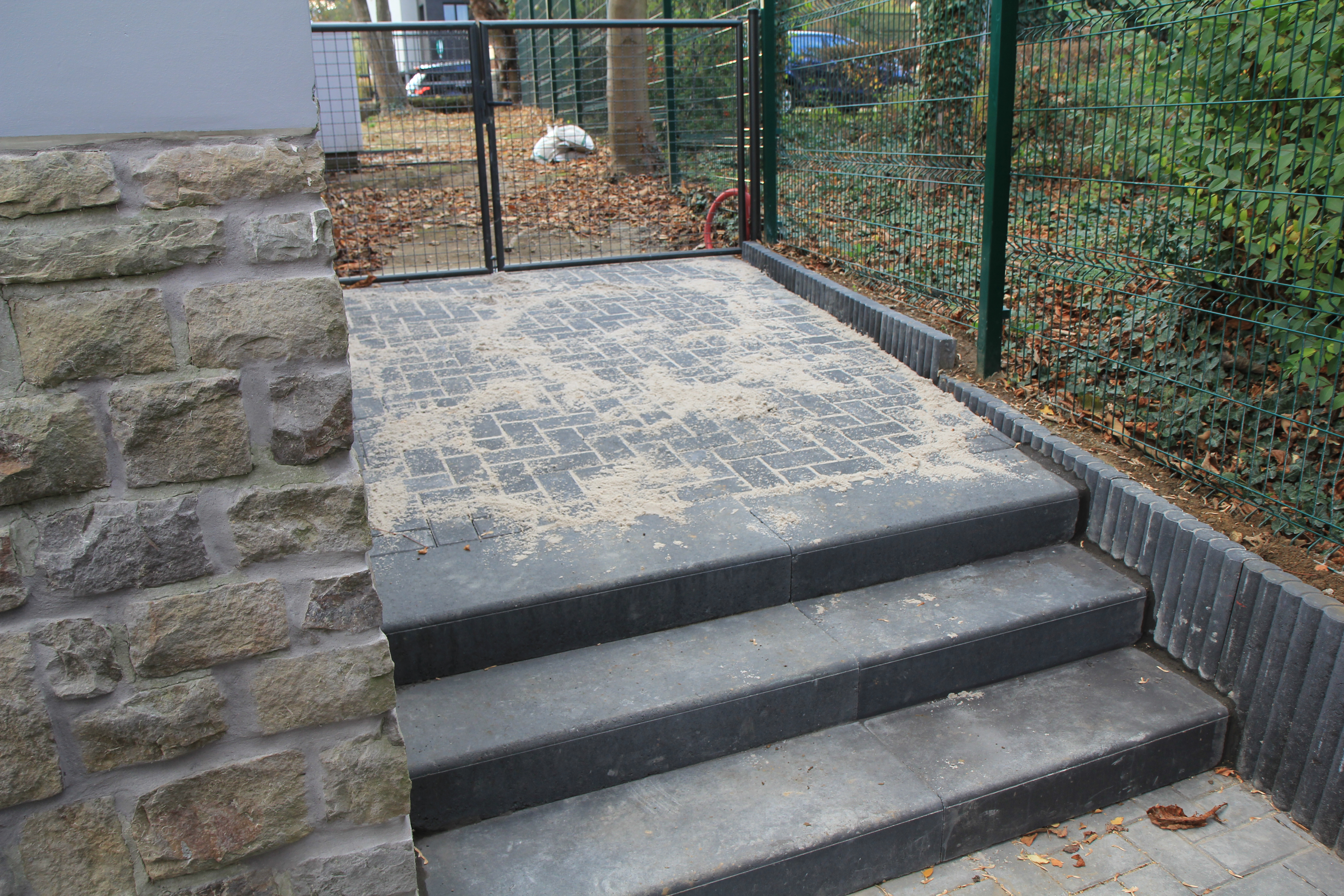 Terras werk uitgewerkt met betonnen traptreden om het hoogteverschil uit te werken.